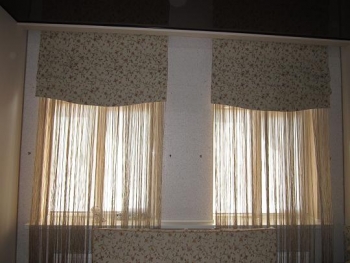 Квартира-студия студентки в новострое, выполненная в эконом-варианте. На окнах декоративные нити и ламбрекены из гобелена, отшитые в виде каскадных римских штор. На деревянном диване-лавке для уюта и комфорта выложены матрацы-подушки из гобелена и декоративные подушечки.