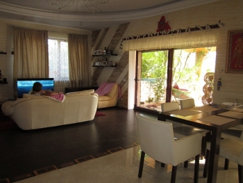 В доме на Большом Фонтане, выполненном вначале в индийском стиле, хозяйка захотела добавить романтики, не потеряв при этом связующего восточного звена. В гостиной и кухне-столовой мы повесили французские кружевные гардины, добавив петли-бантики из бордового и молочного атласов, а лестничный пролёт украсили австрийской шторой из золотистой органзы, декорировав нижний край кружевом и атласной бордовой окантовкой.