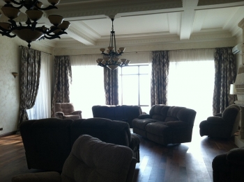 Хозяйскую спальню с панорамным окном решено было декорировать пышными портьерами из итальянского атласа с цветочным орнаментом и французскими гардинами с вышивкой, выполненными по индивидуальному дизайну, совместной разработке наших декораторов и французов.