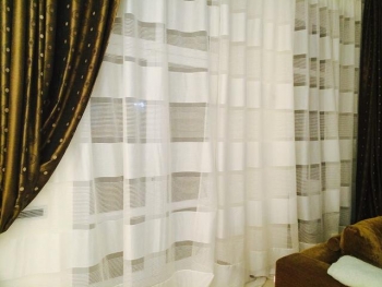 Панорамные окна в большой гостиной декорированы белой гардиной с широкой горизонтальной полосой и шоколадными шторами из тафты на подкладе.
